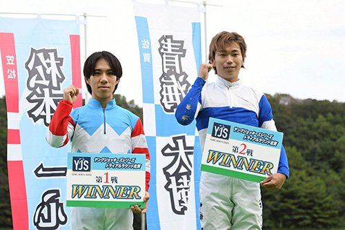 表彰式で第1戦優勝の松本一心騎手(左)と第2戦優勝の青海大樹騎手(NAR提供)