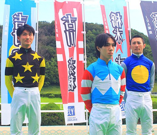 YJS佐賀の騎手紹介式で松本一心騎手(中央)、明星晴大騎手(左)