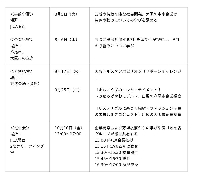 JICA関西は2025年8月から10月にかけ、開発途上国からのJICA留学生(*)約40人(24か国)を対象に、公益財団法人 太平洋人材交流センター(PREX)と共催で「JICA留学生と万博参画企業との共創」と題したプログラムを実施します。
