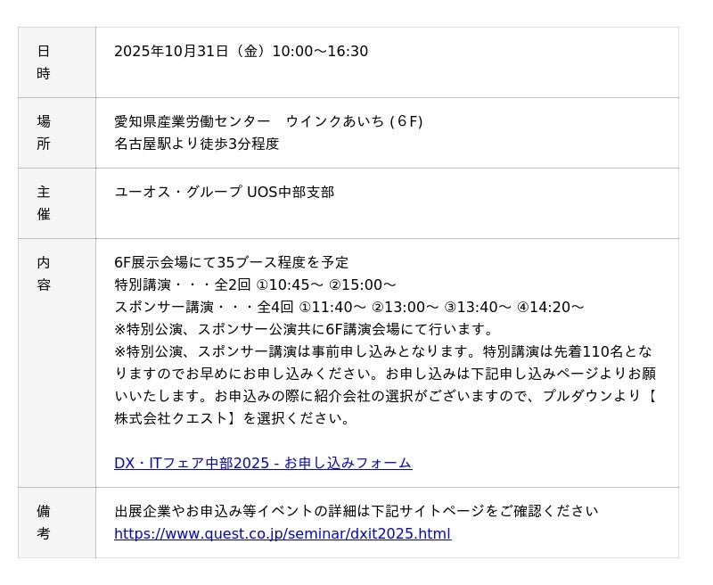 株式会社クエスト(本社:東京都港区、代表取締役会長兼社長執行役員:鎌田 智)は、2025年10月31日(金)に愛知県産業労働センターウインクあいちで行われる「DX・ITフェア中部 2025」に出展、スポンサー講演に登壇いたします。