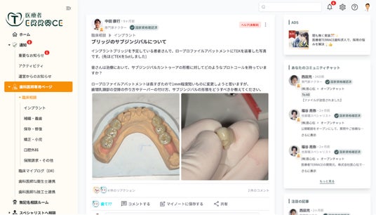 国家資格の確認を終えた歯科医師は、全国の歯科医師が集う専用ページ内で臨床相談を無料で実施出来ます。歯科医師・歯科衛生士・歯科技工士は、資格に応じた専用ページに参加でき、職種間の連携スレッドや臨床マイブログという記事を閲覧することが出来ます。