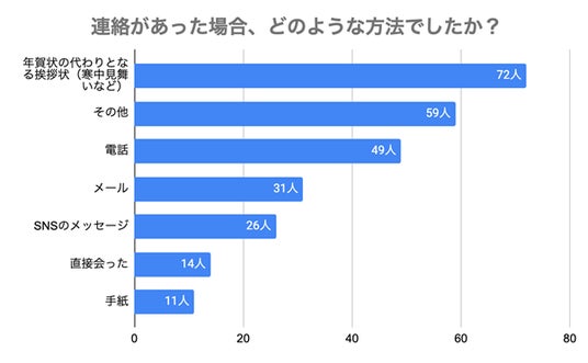 喪中はがきに対する連絡方法として最も多かったのが「寒中見舞いなどの挨拶状」で、72人が選択しました。