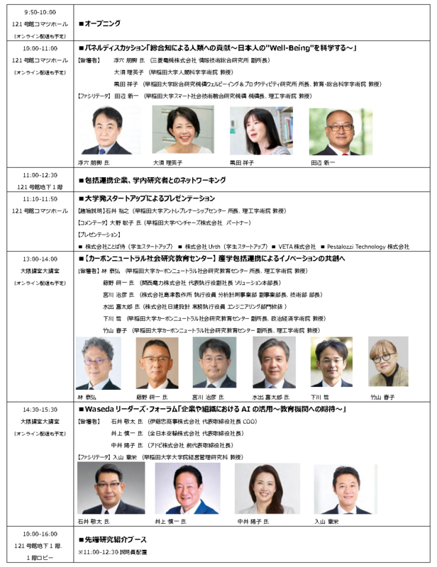 早稲田大学のトップ研究者と身近に交流できる機会ですので、産学連携や共同研究をお考えの方、早稲田大学が推進する総合知、最先端の研究・技術情報にご関心のある方は奮ってご参加ください。