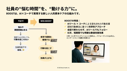 Boost Health株式会社(本社:東京都港区、代表取締役CEO:芳賀彩花、以下Boost Health)は、パフォーマンス向上と休職・離職防止を両立する、AI×コーチのハイブリッド型社員支援サービス「BOOST」を提供しています。
