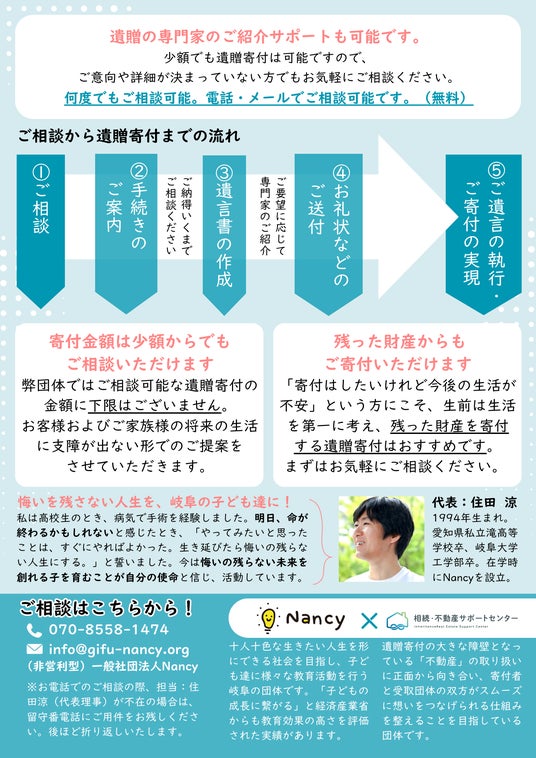 一般社団法人Nancy(所在地:岐阜県岐阜市、代表:住田涼、以下Nancy)はNPO法人相続・不動産サポートセンター(所在地:東京都渋谷区、代表:宮川大輝)と連携し、遺贈によるご寄付や相続財産のご寄付に関する業務提携を締結いたしました。