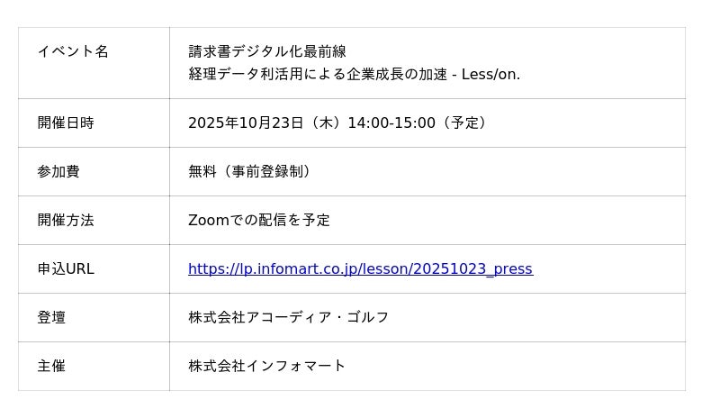 デジタルの力であらゆる業務を効率化する株式会社インフォマート(本社:東京都港区 代表取締役社長:中島 健、以下「当社」)は、企業のDX・デジタルシフトを推進する「学びの場」として、1DAYオンラインイベント「Less/on.(レッスン) 」を2025年10月23日(木)に開催します。