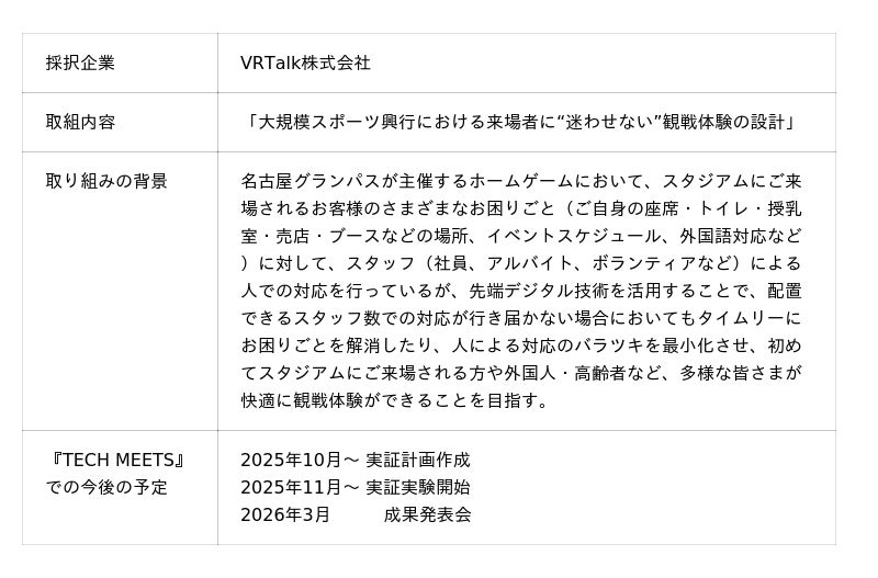 この取り組みは、日本最大級のオープンイノベーションプラットフォーム「AUBA」を運営する株式会社eiicon(エイコン)が、愛知県とともに実施する、あいちデジタルアイランドプロジェクト『TECH MEETS(テック ミーツ)』において、名古屋グランパスがニーズ企業(自社の課題解決や付加価値の創出を目指す企業)となり、VRTalk株式会社様がシーズ企業(提示したテーマに対して、先端デジタル技術を提供する企業)としてマッチングされ、実現したものです。