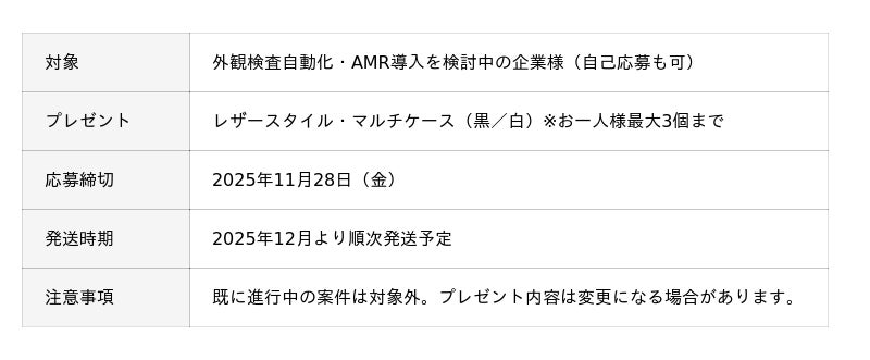 展示会の開催にあわせて、「外観検査・AMR導入ご紹介キャンペーン」を実施します。<キャンペーン概要>