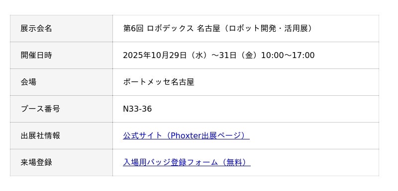 2025年10月29日(水)~31日(金)にポートメッセ名古屋で開催される「第6回 ロボデックス 名古屋(ロボット開発・活用展)」において、株式会社Phoxter(本社:大阪府豊中市、代表取締役:園田 淳一)は、業界初*の生成AI機能を搭載した自社開発AMR「StellaDrive」をはじめとする、製造・物流現場向けの最新ソリューションを出展いたします。