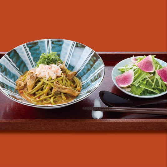 トマトソースと蟹出汁、米糀ミルクを合わせた、まろやかな味わいの和風トマトクリームソースのパスタです。紅ずわい蟹、舞茸、大葉、白いりごまをトッピングしました。麺は、抹茶の原料であるてん茶 を練り込んだ「京抹茶の生パスタ」を使用しています。