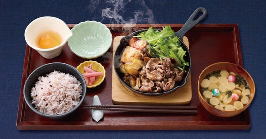 国産黒毛和牛の肩ロースを使用した、揚げ出し豆腐、長ネギ、しらたき、舞茸、水菜、プチトマト入りの贅沢なすき焼きお膳です。美味しさのこだわりは、黒毛和牛の旨味をたっぷり吸った揚げ出し豆腐。割り下と牛肉の旨味が染み込み、奥深い味わいが楽しめます。さらにプチトマトを加えたことで、ほどよい酸味が加わり、後味を爽やかに引き立てています。シャキシャキとした水菜の歯ごたえが、全体に軽やかなアクセントを加えています。具材を別添えの溶き卵に絡めて、お楽しみください。