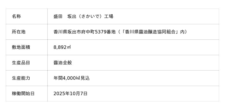 株式会社JFLAホールディングス(本社:東京都中央区/代表取締役社長:檜垣周作)の子会社である盛田株式会社(本社:愛知県名古屋市/代表取締役社長:檜垣周作)は、香川県醤油醸造協同組合(所在地:香川県坂出市/代表:川原信介)の工場設備を使用し、「盛田 坂出工場」として醤油製造を開始しましたことをお知らせいたします。