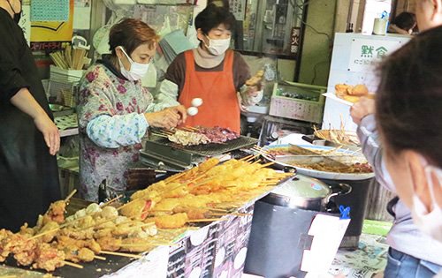 串カツや唐揚げなどを求めて、にぎわう笠松競馬場内の飲食店。ご当地グルメはおいしいと評判で、ファンの楽しみでもある