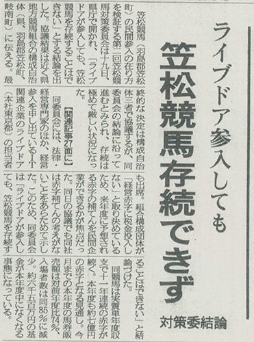 「競馬事業の経営赤字に税金は投入しない。県民の理解を得られないから」と競馬組合構成団体(岐阜県、笠松町、岐南町)の強い姿勢に、ライブドア側の参入案はトーンダウン。「馬券のネット販売ではサポートするが、赤字分は補てんしない」との意向を笠松競馬対策員会に示した。