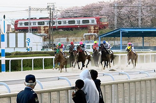 桜並木と名鉄電車ををバックに、人馬の攻防は迫力満点