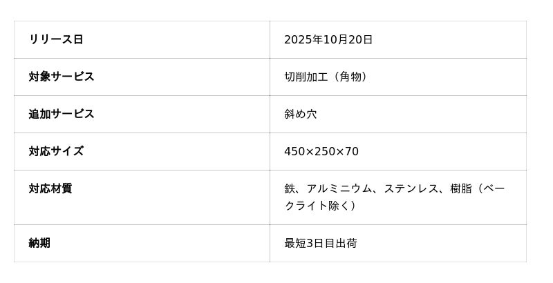 機械部品調達のAIプラットフォーム「meviy(メビー)」(サービス提供元:株式会社ミスミグループ本社)は、2025年10月20日より、切削加工(角物)(以下、切削角物)において、斜め穴部品への対応を開始します。これにより、自動車・産業機械・ロボット業界をはじめとする幅広い分野で活用範囲が拡大し、現場のボトルネックを解消します。
