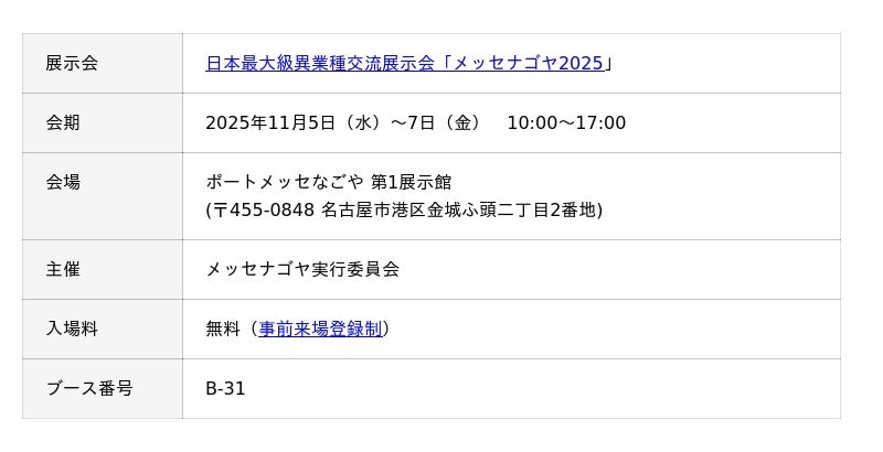 株式会社テクノア(本社:岐阜県岐阜市、代表取締役:山崎 耕治)は、11月5日~7日に ポートメッセなごや で開催される 日本最大級異業種交流展示会「メッセナゴヤ2025」 に出展いたします。