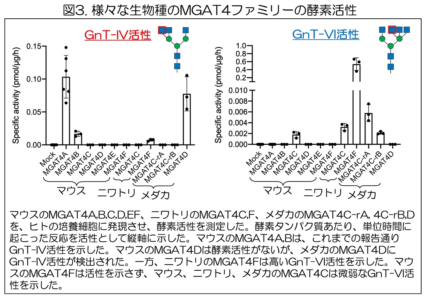 さらに、メダカの酵素では、Cはマウスやトリと同じく微弱なGnT-VI活性を示すのみでしたが、哺乳類では全く活性が見られなかったDが強いGnT-IV活性を示すことがわかりました。