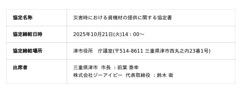 株式会社ジーアイビー(本社:愛知県名古屋市中区、代表取締役:鈴木 衛)は、2025年10月21日(火)14時より、三重県津市と全国60カ所目となる災害協定「災害時における資機材の提供に関する協定」を締結いたします。本協定締結式には、津市・前葉泰幸市長にもご臨席いただく予定です。