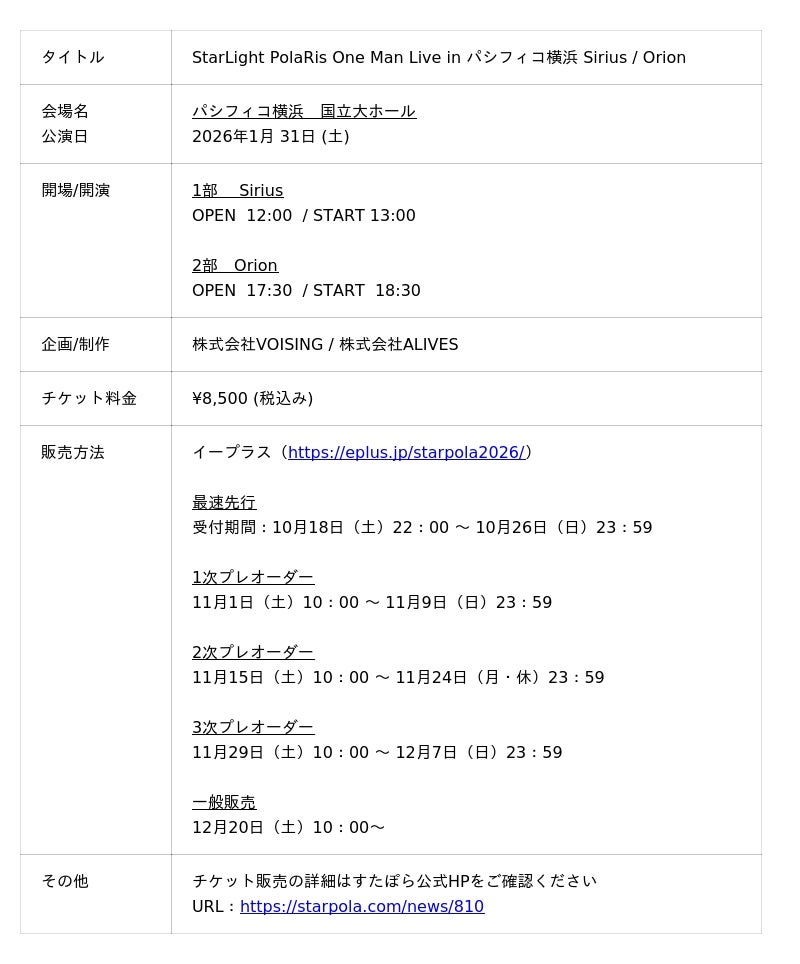 株式会社VOISING(本社:東京都港区、代表者:ないこ、以下、VOISING)所属の2.5次元アイドルグループ「すたぽら」が自身初となるホールライブ『StarLight PolaRis One Man Live in パシフィコ横浜 Sirius / Orion』を2026年1月31日(土)に神奈川・パシフィコ横浜 国立大ホールにて開催することが決定いたしました。