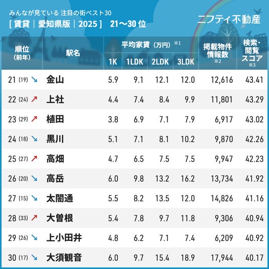 今回は、愛知県で賃貸物件を探しているユーザーからの注目を集めた街ランキングベスト30(2025年)を発表いたします。