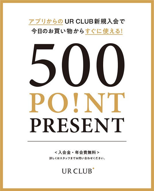 2025年10月31日(金)から11月9日(日)の期間、アーバンリサーチ公式アプリからUR CLUBに新規入会いただいた方へ、その日のお買い物からすぐにお使いいただける500ptをプレゼント。お得にお買い物ができるチャンスです! ぜひ未入会の方は、この機会をご利用ください。