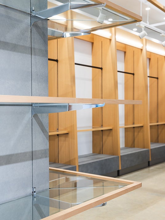 warehouseとは倉庫という意味。そんな由来にちなんだ内装は、これまでのwarehouseとはまた違った表情で作りました。これまでのアウトレットらしい広々した店内とゆったり見ていただける回遊のしやすさはそのままに、スタイリッシュな倉庫として見応えのある商品量で皆様をお出迎え。