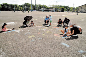 地面に思いっきり落書き 人工芝敷設前の可児市運動公園 アニメキャラや「野球頑張るぞ」