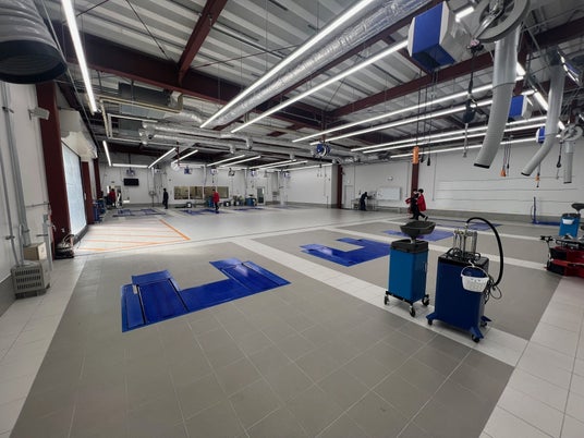 ピットは4レーン×4レーンを対面型で配置。冷暖房も完備し作業効率を向上。