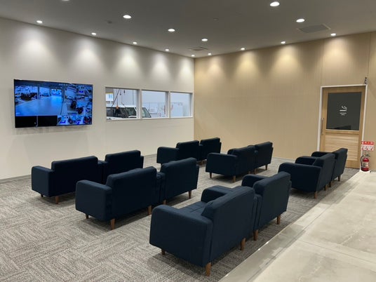 さらに、整備・点検をお待ちいただく間も快適にお過ごしいただけるよう、待合スペースには1.5人掛けのゆったりとしたソファをご用意。ガラス越しに整備工場を見渡せるレイアウトとなっており、ご自身の愛車が整備されている様子を安心してご確認いただけます。