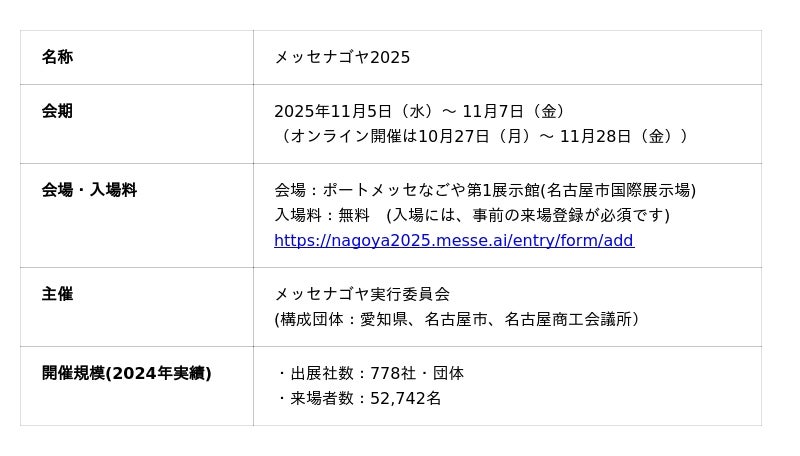 豊田通商株式会社(以下、豊田通商)、及びグループ会社であるエレマテック株式会社、株式会社ティー・エー・エス、豊通ファシリティーズ株式会社、株式会社豊通マシナリー、豊通ユニファッション株式会社、株式会社ネクスティ エレクトロニクス、株式会社プラニック、資本業務提携先のFlora株式会社、並びに豊田通商が共同設立した一般社団法人炭素会計アドバイザー協会の10社・団体は、2025年11月5日(水)から7日(金)に開催される日本最大級の異業種交流展示会「メッセナゴヤ2025」に出展いたします。