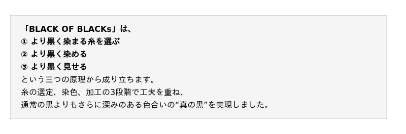 「BLACK OF BLACKs」は、多くの方が1枚は持っているであろうスタンダードな”黒”という色に着目し、上質感のある深い黒を追求した独自開発生地による商品群です。染料や加工と相性の良い糸を選定し、特殊な染色技術と特別な加工を施すことにより、通常の黒よりも更に深みのある色合いを実現。色の明るさを表わすL値(※2)も、セーレン(株)の基準では17以下が濃い黒の目安であるところ、「BLACK OF BLACKs」では14.5~16.9という値を達成しています。「BLACK OF BLACKs」は、当社が着眼した「上質感のある深い黒」の実現に向け、セーレン(株)の差別化技術を活用して共同開発を進め、約2年にわたる研究と試作を重ねて完成させた独自の製品です。(※2) L値: 色の明るさ(明度)を表す国際的な指標。0~100の数値で表され、0が「完全な黒」、100が「純粋な白」を意味します。数値が小さいほど暗く、大きいほど明るい色となります。