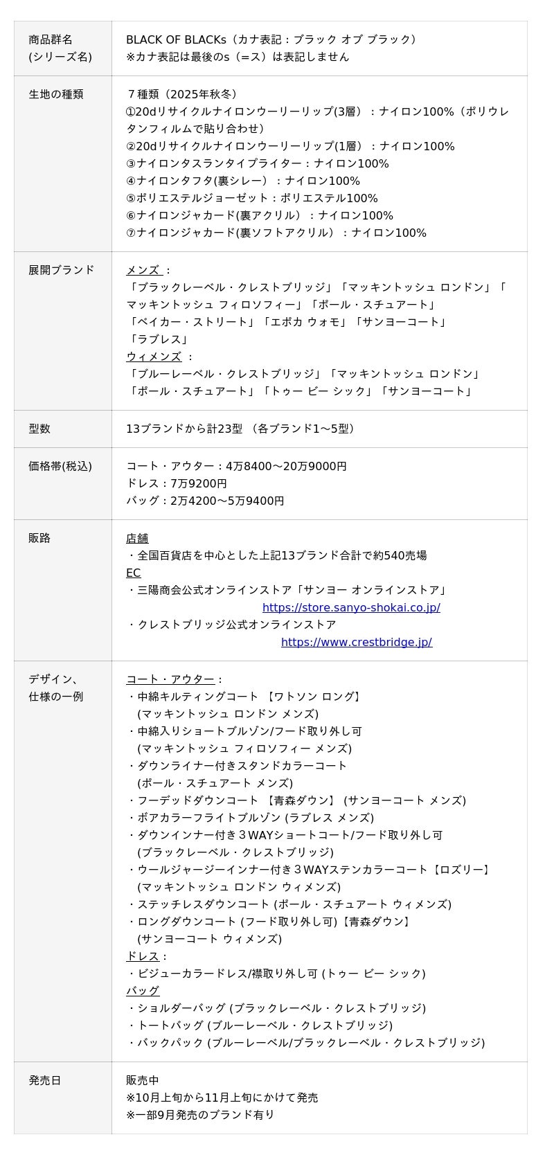 三陽商会は、上質感のある深い黒を追求した独自開発生地による商品群「BLACK OF BLACKs(ブラック オブ ブラック)」の2025年秋冬の新作の販売を開始しました。「マッキントッシュ ロンドン」「ポール・スチュアート」「サンヨーコート」など13ブランドから、コート・ブルゾン、ドレス、バッグアイテム計23型を、全国百貨店・直営店及び当社公式オンラインストア等にて10月上旬から11月上旬にかけて順次発売いたします。