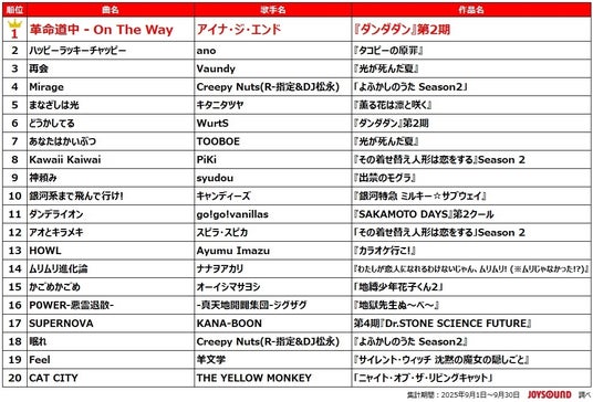 話題作の放送開始にあわせて主題歌が大きな支持を集めた今夏、『ダンダダン』第2期のオープニングテーマ、アイナ・ジ・エンド「革命道中 - On The Way」が堂々の1位を獲得!オカルト×青春という作品の世界観に寄り添った幻想的なメロディがリスナーを魅了し、エンディング・テーマのWurtS「どうかしてる」も6位にランクインしました。また、全6話ながら大きな話題となった『タコピーの原罪』も健闘し、オープニングのano「ハッピーラッキーチャッピー」が2位にランクイン。“救いを求める声”を歌詞に込めたダークポップ×エモロックな一曲として注目を集めました。
