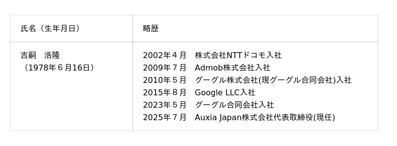 吉嗣浩隆氏は、20年以上にわたりプラットフォームエコシステムの構築に従事し、NTTドコモでiモードのパートナーシップを担当後、AdMob東京オフィスの立ち上げに参画。Googleによる買収後は、日本にてGoogle Playの立ち上げをゼロから構築し、その後米国本社にてGoogle Playのパートナー国際展開支援策を構築し、その後は日本においてGoogle Playパートナーシップ事業を統括した豊富な経験と当社事業への深い理解、また国内外の幅広いアプリ提供事業会社との繋がりを有し、これらの実績・経験から、当社経営に対し幅広い助言をいただき、当社の今後の事業成長に十分な役割を果たしていただけるものと判断し、社外取締役候補者といたしました。