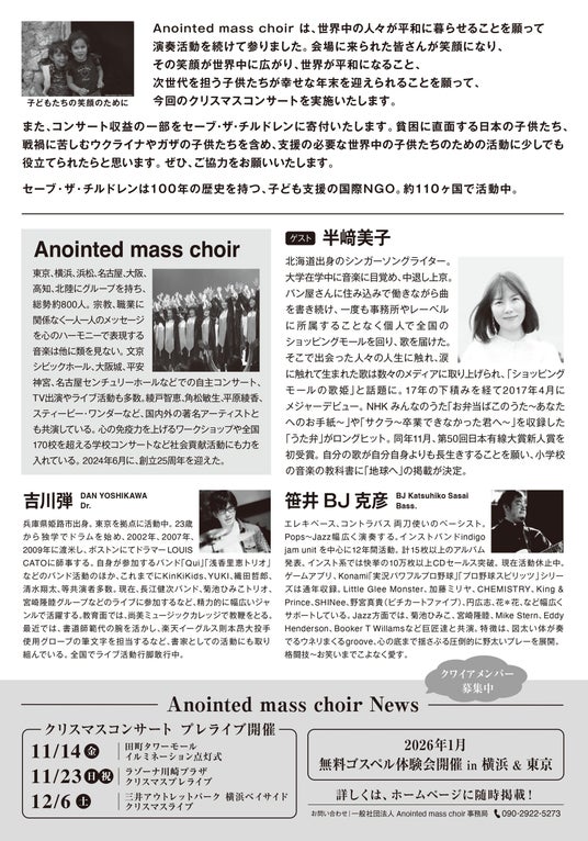 戦後80年となる今年、Anointedは、世界中の人々が平和に暮らせることを願って演奏活動を続けて参りました。会場に来られた皆さんが笑顔になり、その笑顔が世界中に広がり、世界が平和になること、特に次世代を担う子供たちが幸せな年末を迎えられることを願って、今回のクリスマスコンサートを実施致します。