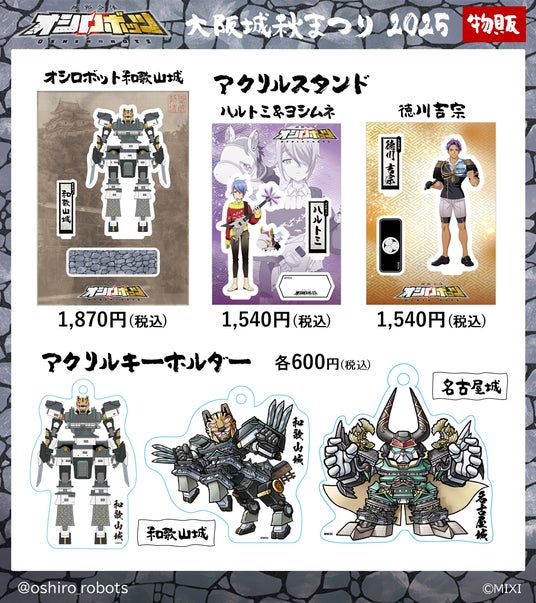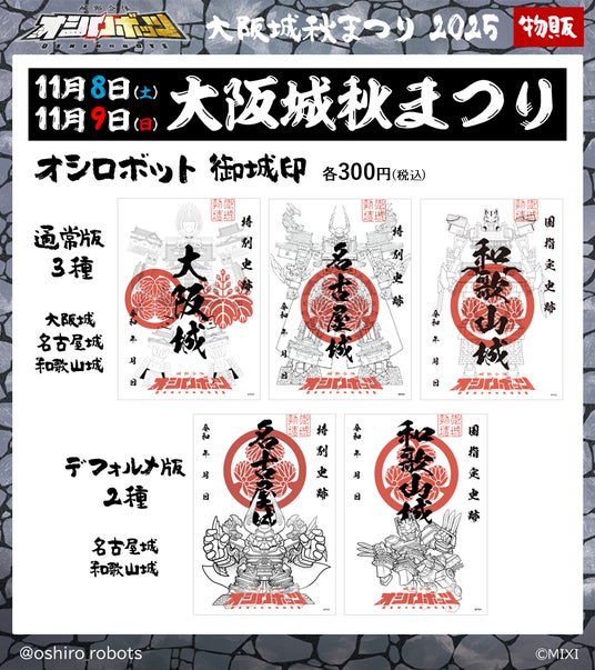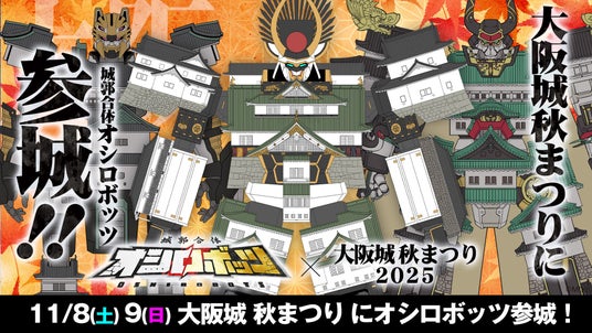株式会社MIXI(東京都渋谷区、代表取締役社長 上級執行役員 CEO:木村 弘毅)は、2025年10月10日(金)から11月24日(月・祝)まで大阪城公園で開催中の「大阪城秋まつり2025」において、11月8日(土)・9日(日)の2日間、MIXI_ANIMEオリジナルコンテンツ『城郭合体オシロボッツ』のブースを出展します。ブースでは、「オシロボット大阪城」のトレーディングカードや解説書(チラシ)の無料配布に加えて、大阪城・名古屋城・和歌山城のオシロボッツグッズの販売も予定しています。