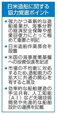 覚書には米国の海事産業基盤への投資促進が記載される。造船分野で圧倒的な世界シェアを誇る中国を念頭に「造船能力の拡大に共通の関心を有する」と言及する見通しだ。
