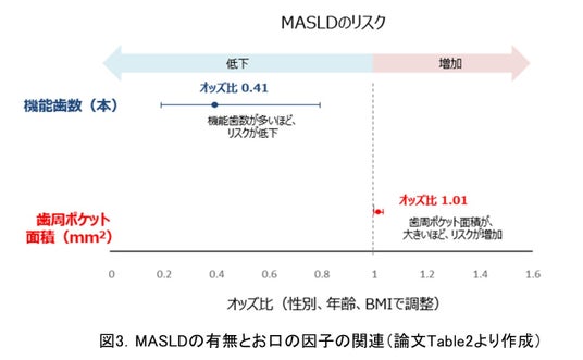 MASLDの方と健常な方のお口の状態を比較したしたところ、口腔衛生、むし歯、歯周病の状態には統計的に有意な差が認められました(歯周病:図2)。口腔機能の中では、咀嚼能力や舌圧、口腔機能の巧緻性の項目においては有意な差は認められませんでしたが、機能歯数と唾液分泌能には有意な差が認められました(機能歯数:図2)。さらに、年齢、性別、肥満などの要因を調整した結果においても、MASLDの有無と歯周病および機能歯数は独立した有意な関連が示されました。歯周ポケット面積が1mm2増加するごとに、MASLDであるオッズ比が1.01倍、機能歯数が1本多いごとに0.41倍になることが示されました(図3)。このことから、歯周ポケット面積が大きいほど、MASLDのリスクは高く、機能歯数が多いほどリスクは低いと言えます。