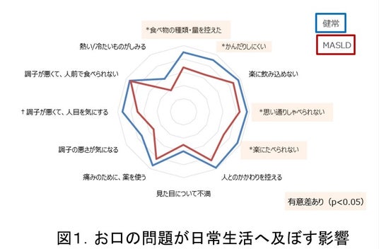 お口の問題がQOLへ及ぼす影響について、GOHAIを用いて評価したところ、健常な方に比べてMASLDの方は、大きな影響を受けていることが分かりました。特に、食事や会話など機能面における影響は、健常な方とMASLDの方の間で有意な差が認められました(図1)。