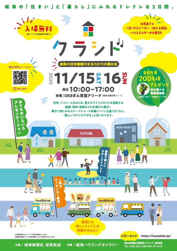 岐阜新聞社(本社:岐阜県岐阜市)と岐阜放送(本社:岐阜県岐阜市)は、2025年11月15日(土)、16日(日)にOKBぎふ清流アリーナにて住まいと暮らしの総合展示会「クラシド♪2025」を開催します。