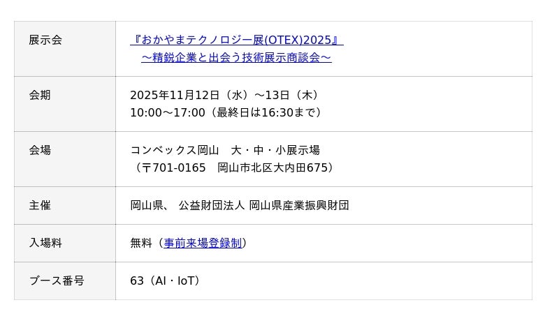 株式会社テクノア(本社:岐阜県岐阜市、代表取締役:山崎 耕治)は、11月12日~13日に コンベックス岡山で開催される「おかやまテクノロジー展(OTEX)2025 ~精鋭企業と出会う技術展示商談会~」に出展いたします。