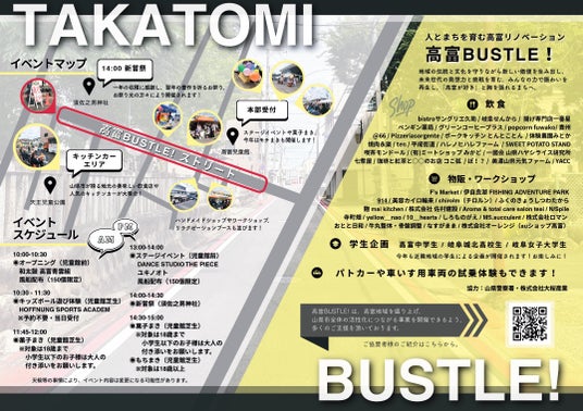 高富商店街活性化協議会 高富BUSTLE!実行委員会(委員長 田崎 豪 以下 当会)は、昨年3,000人の来場者で大いに賑わった歩行者天国イベント『高富BUSTLE!(バッスル)』を以下の通り開催します!
