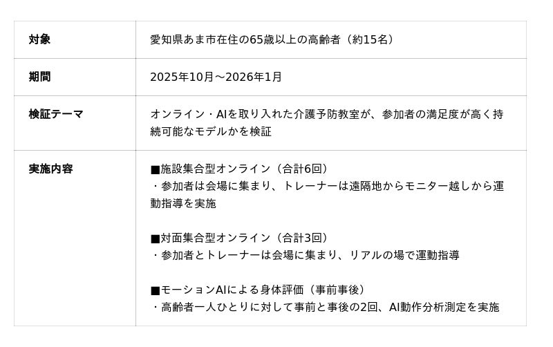本実証実験は、65歳以上の高齢者約15名を対象に、遠隔地のトレーナーとモニター越しにコミュニケーションを取りながら実施するオンライン体操と、参加者の動作データをAIで解析して身体評価を行うツールを活用し、最適な運動プログラムを提供するものです。
