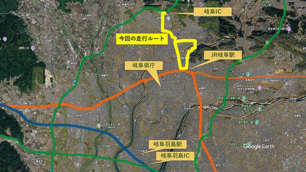 まずは、岐阜市内を1周する循環ルートです。今回はJR岐阜駅前から名鉄岐阜駅前を通り、長良橋通りを北上、岐阜公園・岐阜城を通り、長良川の北側を通り、忠節橋通り経由で岐阜駅前に戻るルートを想定しました。