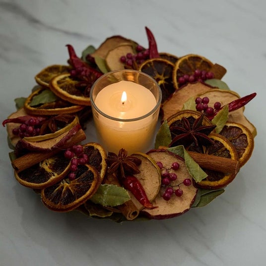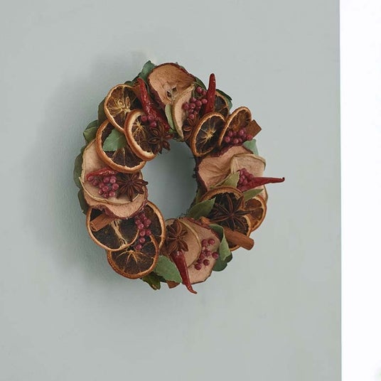 りんごやオレンジ、シナモンや月桂樹などをあしらった、香りもたのしめる、DEAN & DELUCA 特別仕様のドライリース。壁に掛けるのはもちろん、卓上でキャンドルを添えてティーライトリースとしてもお使いいただけます。