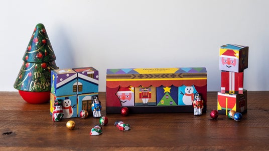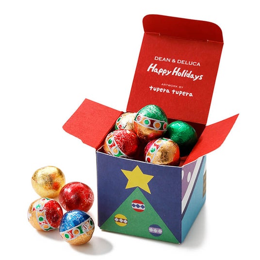 アートユニット『tupera tupera(ツペラツペラ)』が描く特別な原画をモチーフにしたチョコレートボックス。 4つのボックスをパズルのように組み合わせると、ホリデーに欠かせない5つの絵柄と物語が生まれます。舞台をイメージした外箱で、親子で人形劇をたのしんで。