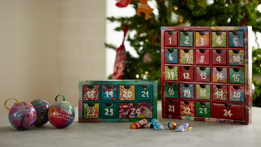 鹿児島の知的障がい者支援施設『しょうぶ学園』の利用者が描き下ろしたアートをモチーフに、ホリデー限定のアドベントカレンダーとオーナメント缶をつくりました。中にはそれぞれ、サンタクロースやコイン型のホイルチョコレートなど、かわいらしいお菓子が入っています。