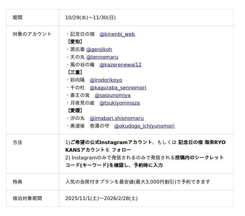 海栄RYOKANSの株式会社海栄館(本社:愛知県知多郡南知多町、代表取締役社長:渡邉玲緒)は、愛知・三重・愛媛の9つの宿泊施設において、Instagram限定「シークレット宿泊プランキャンペーン」を11/30まで期間限定で開催いたします。宿泊対象期間は、2025年11月1日(土)~2026年2月28日(土)です。