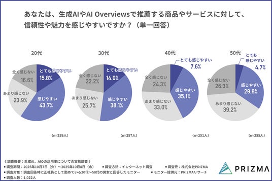 さらに、生成AIやAI Overviewsが推薦する商品やサービスに対して、信頼性や魅力を感じやすいかどうか尋ねたところ、「とても感じやすい」「感じやすい」が20代~30代では半数以上、40代は約4割、50代では約3割となりました。